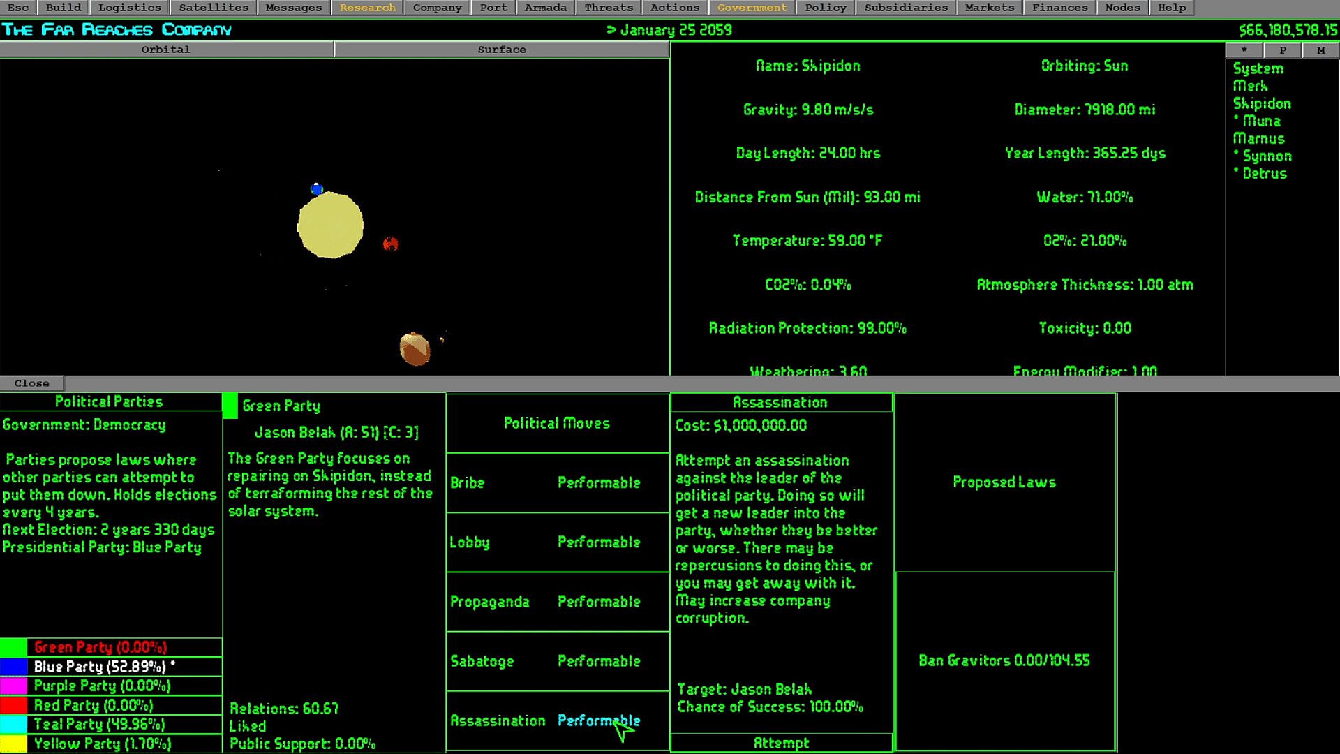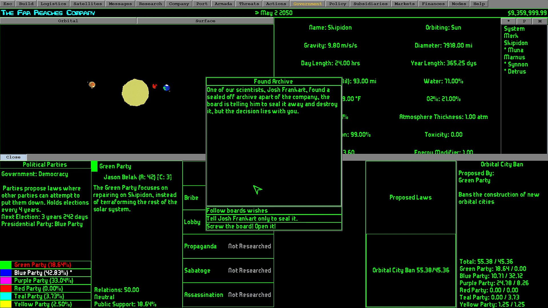 Work with the dynamic politics system where you can manage relations with multiple political parties. Keep out of government or get your company involved to sway the decisions, or even go as far as overthrowing the government to instate your own.