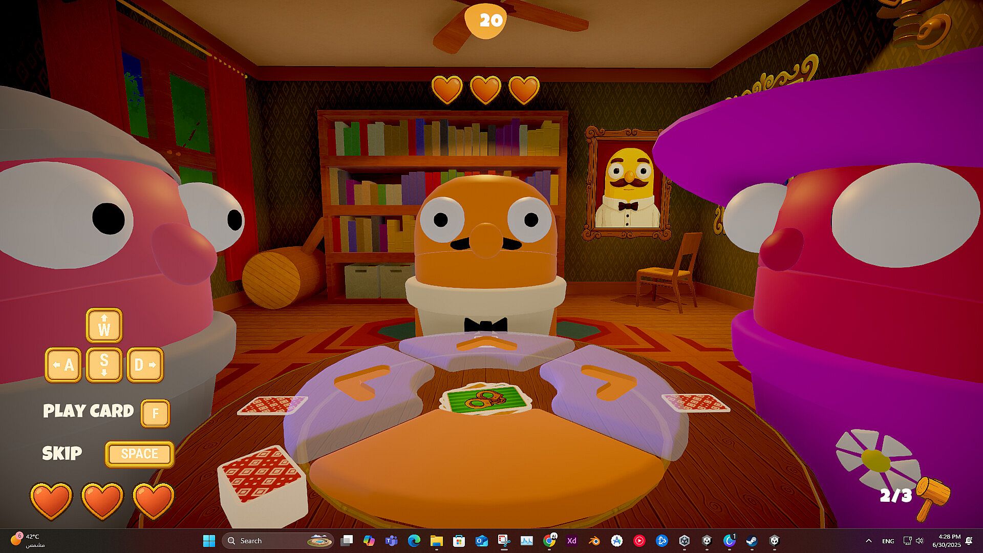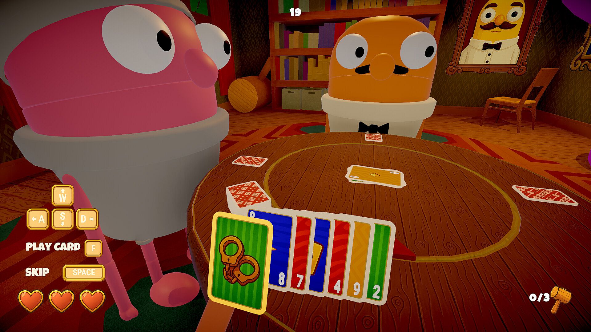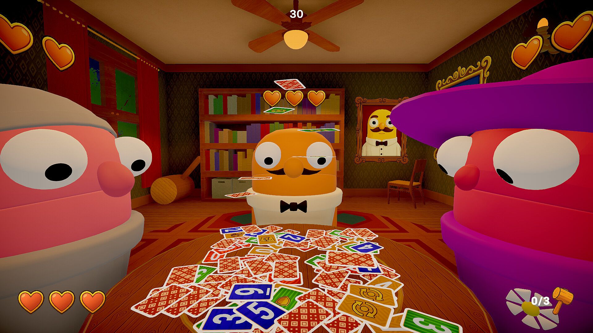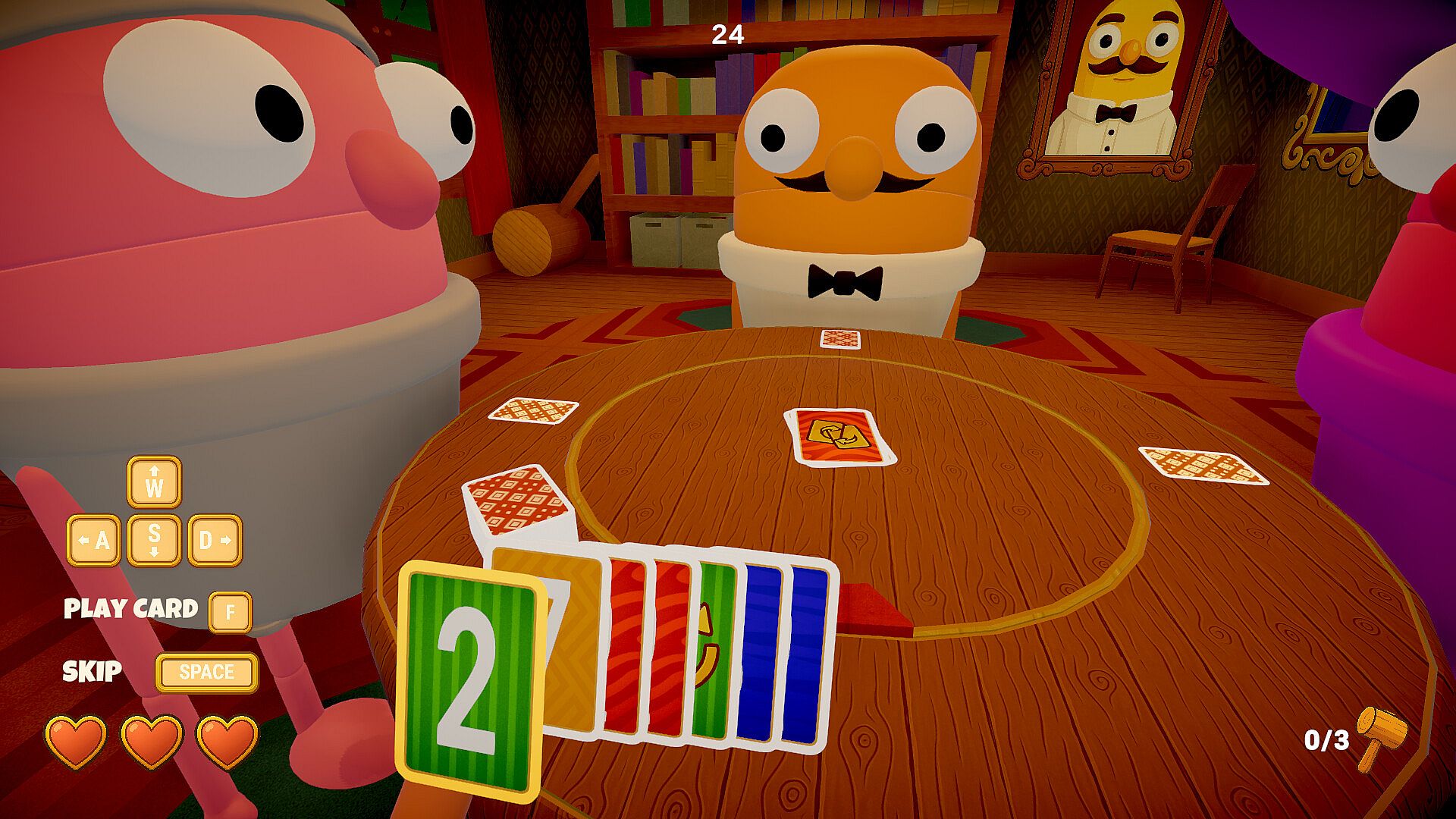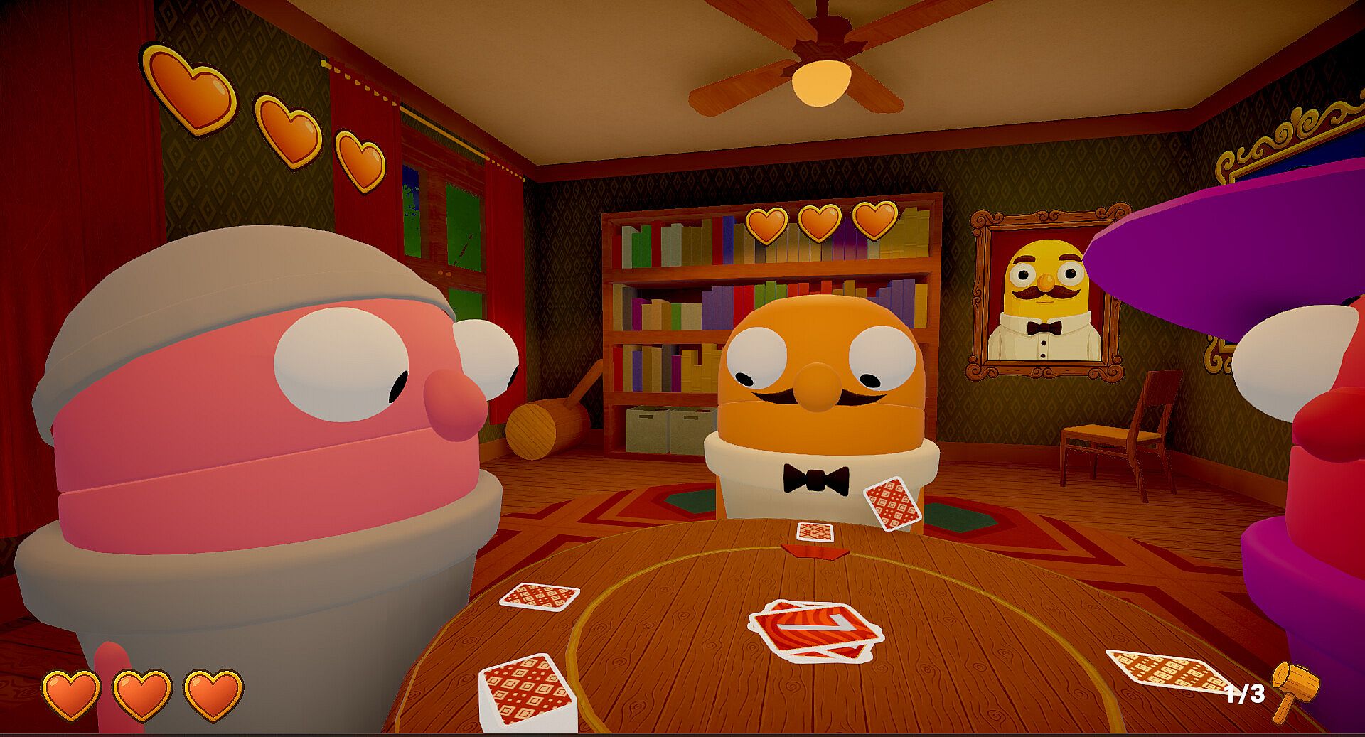 Coins, not hearts. Everyone starts with 50 coins. After each round, losers pay into a shared prize pool based on placement: the closest loser pays 3, the next pays 5, and the last pays 7 (if present). The winner pays nothing and doesn’t take coins mid-match. Spend 2 coins to Redraw and 5 coins to Refill (return 5 discards to your deck). Hit 0 coins and you’re out. At the end of the match, the final winner takes the entire prize pool — punctuated by a very large, very funny hammer.