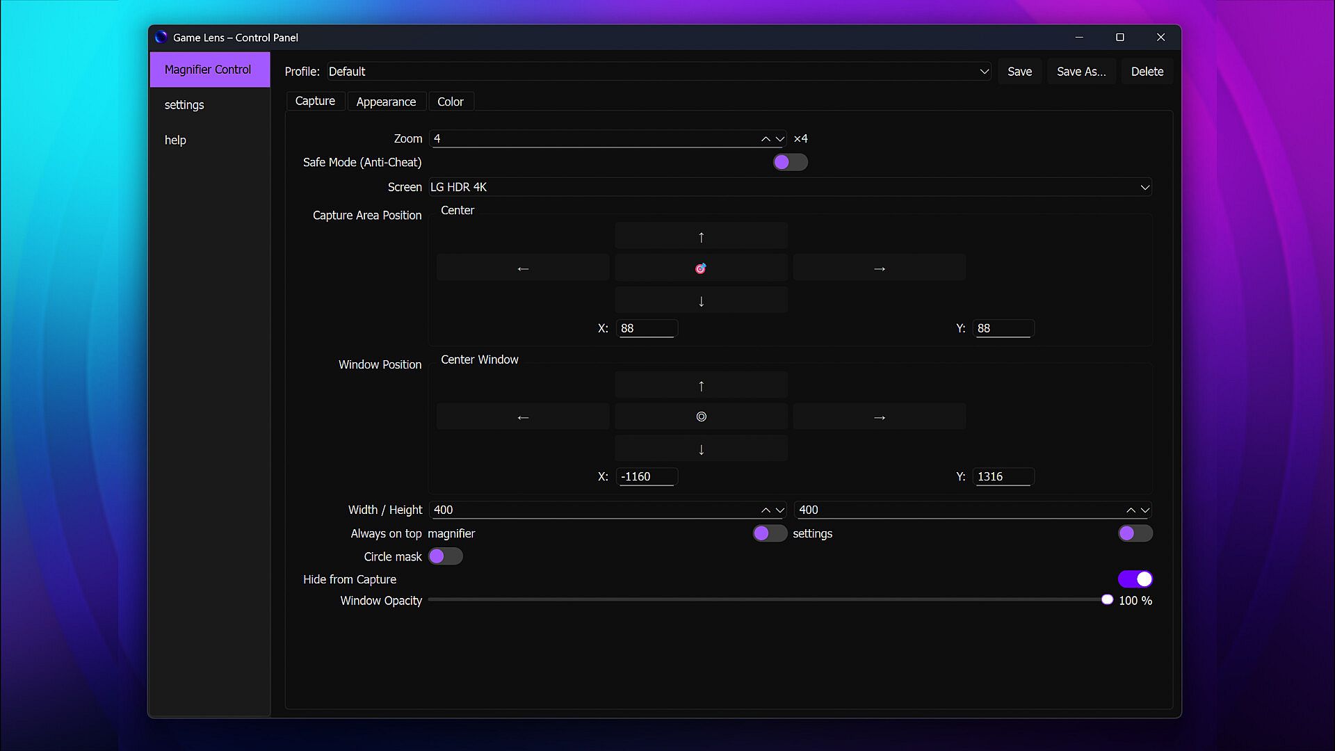 Game Lens works as a frameless overlay window, always on top, smooth and responsive, and optimized for performance. It's designed to stay invisible until you need it — and exactly where you want it.