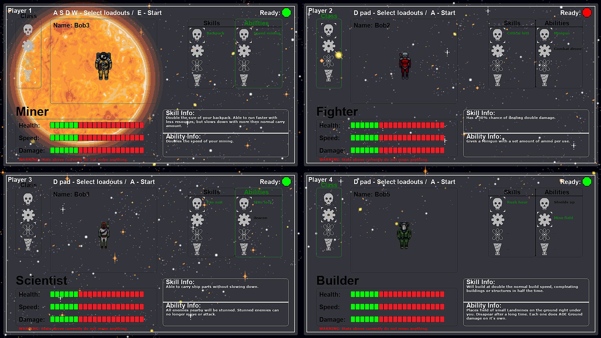 You are a team of researchers going to explore a planet for possible colonization. Unexpected storms have crashed your ship and you are now stranded on the planet's surface. Pick your class from 4, each with their own skills and abilities. Search out for parts to help repair the ship and escape this planet. There is an uneasy feeling you are not alone.